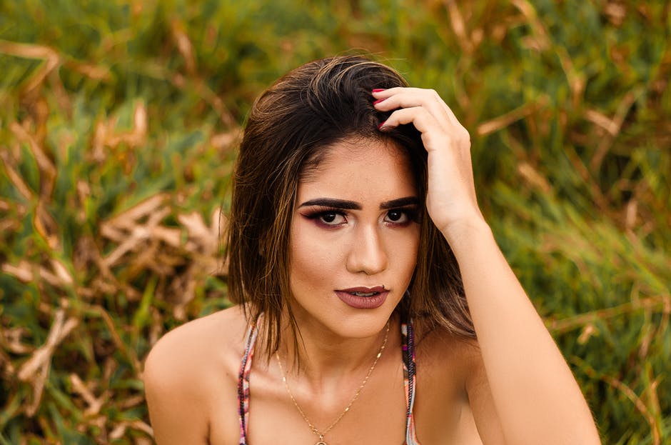 选择性聚焦肖像照片的女人,她的手指穿过她的头发摆姿势 · 免费素材图片