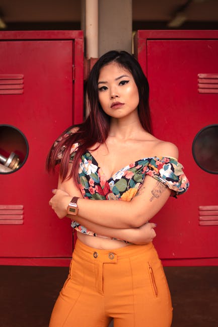 女人在花露肩的作物上衣和橙色的裤子,双臂交叉构成的照片 · 免费素材图片
