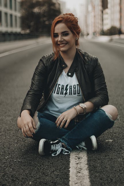 双腿交叉坐在马路中间的微笑妇女的照片 · 免费素材图片