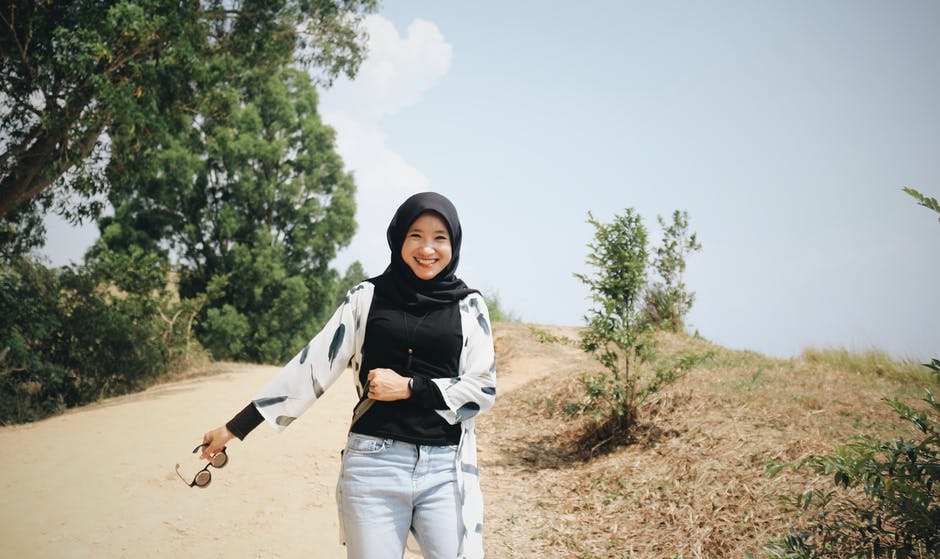 站在土路上的黑头巾的微笑女人的照片 · 免费素材图片