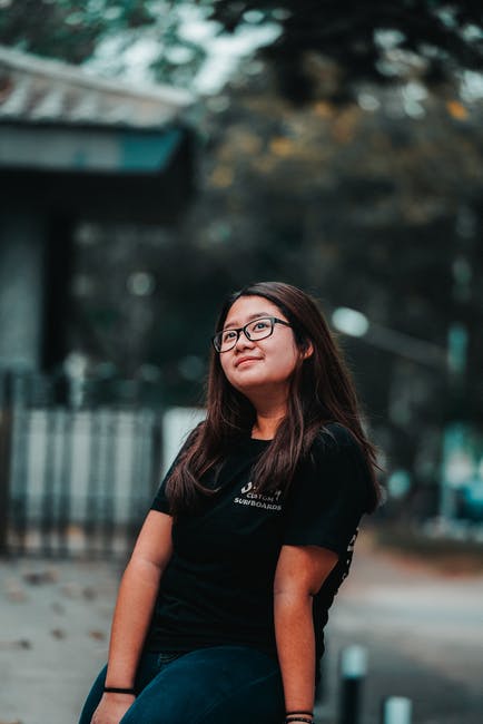黑色的t恤,坐在仰望的女人的选择性聚焦照片 · 免费素材图片
