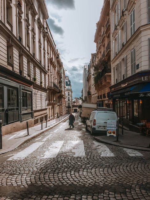 在狭窄的鹅卵石街道上行走,一边停着车辆的人 · 免费素材图片