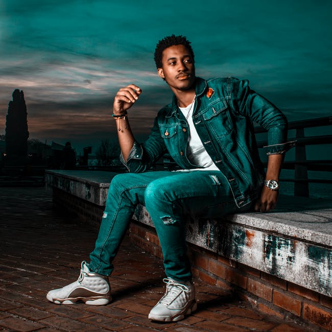 蓝色牛仔夹克和牛仔裤坐在混凝土板上的男人 · 免费素材图片
