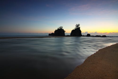 阳光照耀着大海的平静水域及其周围的风景 · 免费素材图片