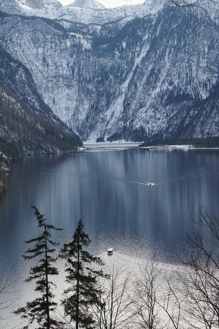树木和冰川山脉附近的水体上的船 · 免费素材图片