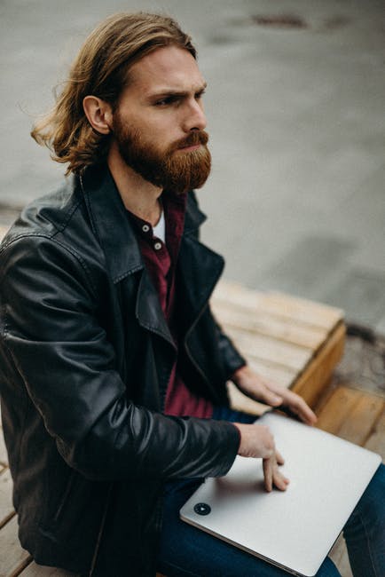男人穿着黑色皮夹克,拿着银色的笔记本电脑 · 免费素材图片