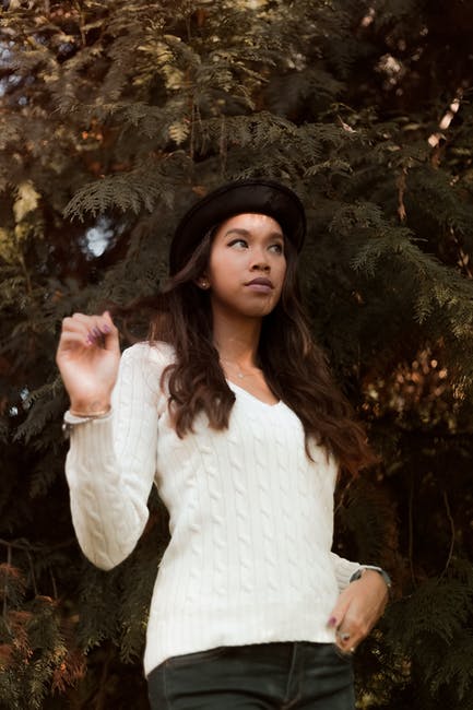 女人穿着白色v领长袖衬衫和黑色的帽子站在绿叶植物附近 · 免费素材图片