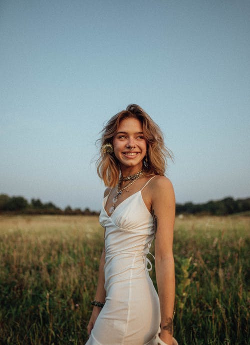 有关垂直拍摄, 女人, 白色洋裝的免费素材图片