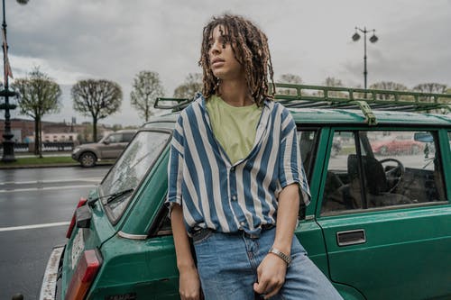 男人穿着蓝色牛仔夹克和棕色的裤子 · 免费素材图片