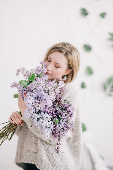 拿着紫色花的白色编织毛线衣的女孩 · 免费素材图片