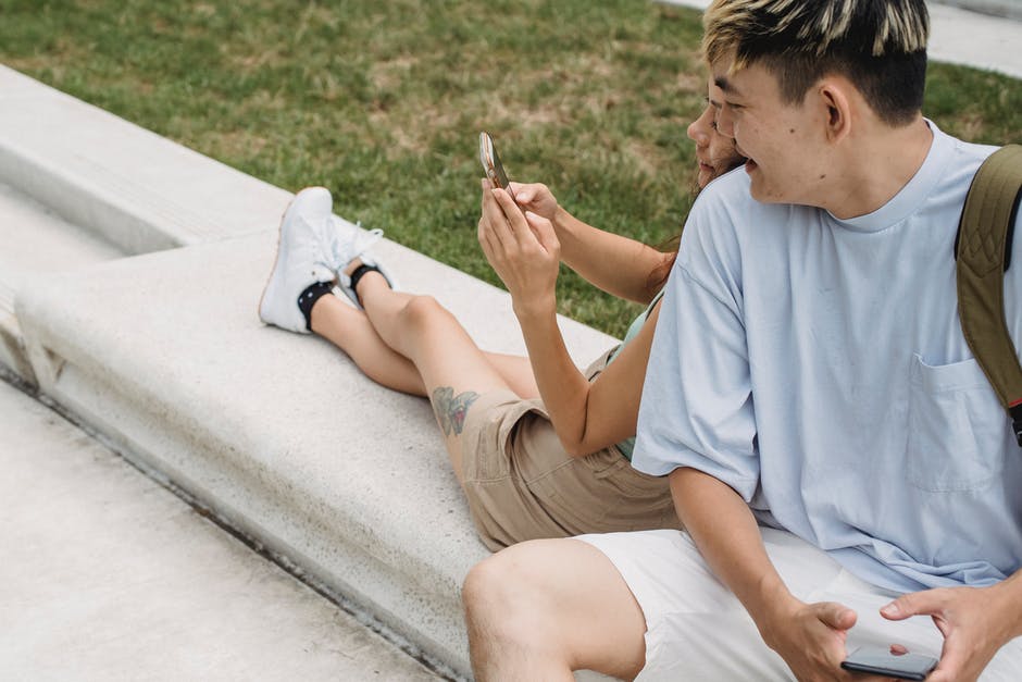 族裔女人与作物亚洲男朋友在城里分享智能手机 · 免费素材图片