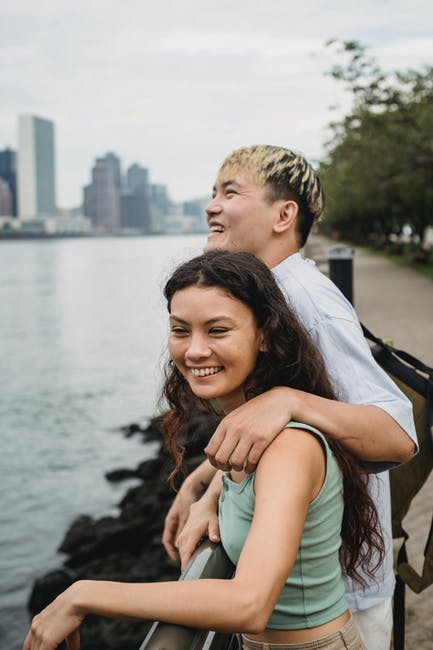 拥抱在长廊上的新人面带笑容 · 免费素材图片