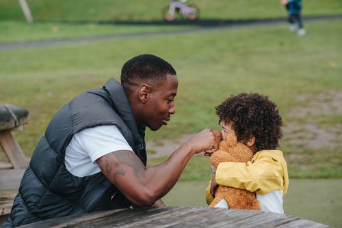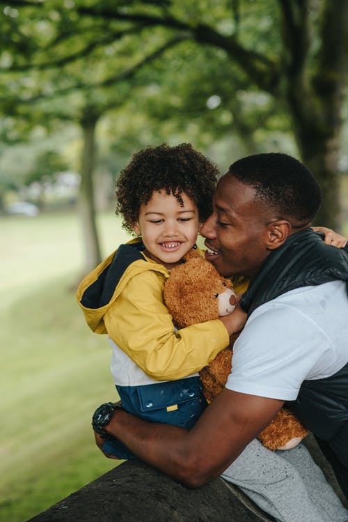 快乐的黑人儿子和父亲坐在公园 · 免费素材图片