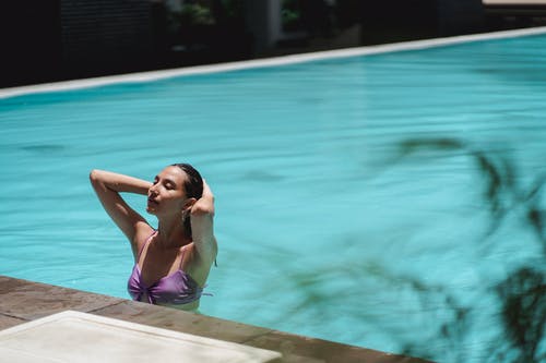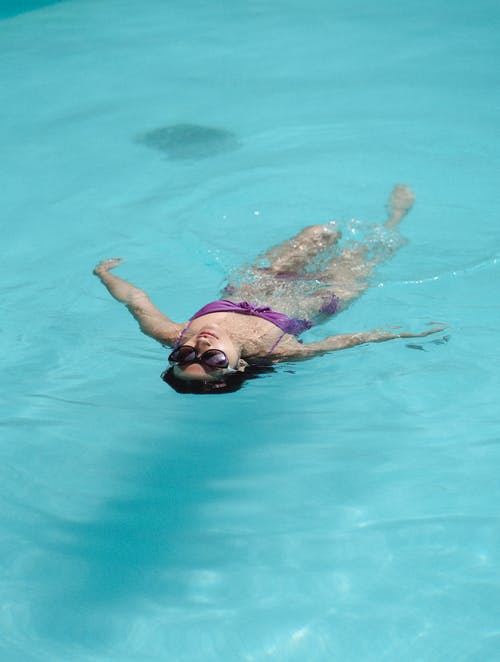 女人躺在游泳池水的充气床垫上 · 免费素材图片