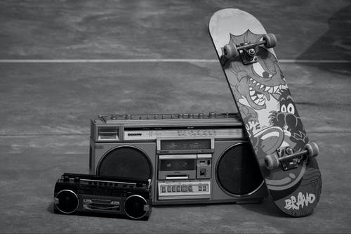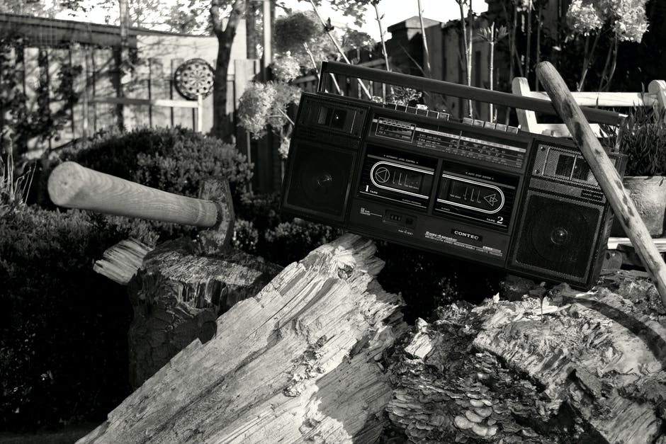 用斧子在树干上的收音机的灰度摄影 · 免费素材图片