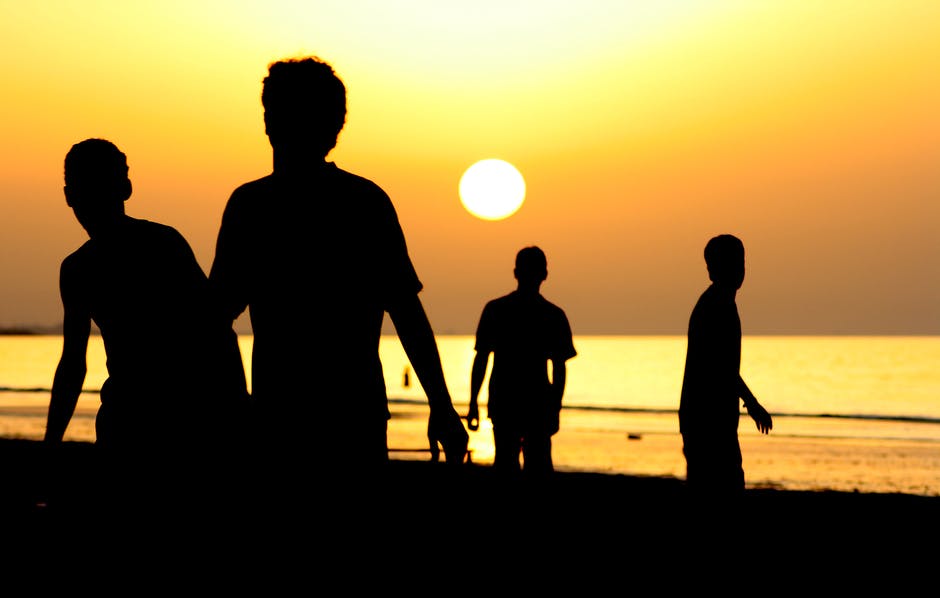 日落期间4人在海洋附近的剪影 · 免费素材图片
