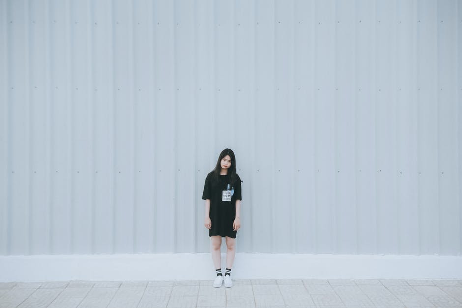 黑色肘袖衬衫和黑色短裤站在白墙后面的女人 · 免费素材图片