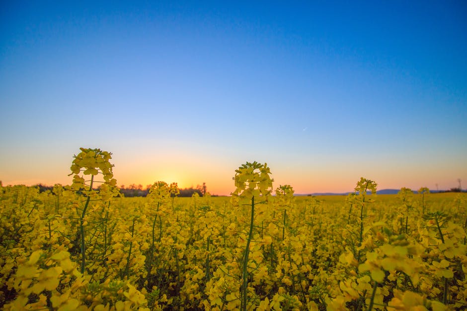 白天蓝蓝的天空下黄色花场的风景摄影 · 免费素材图片
