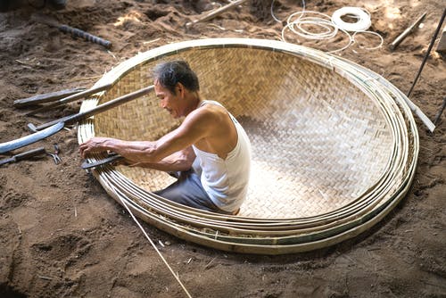 黄色短裤的人坐在棕色木椅子编织 · 免费素材图片