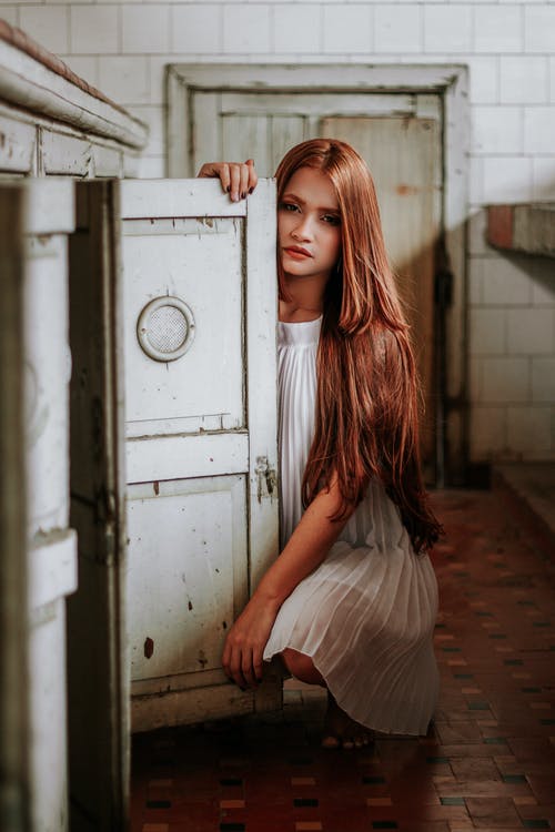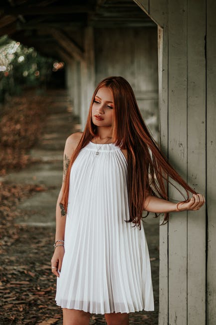站在灰色的木墙上的白色无袖连衣裙的女人 · 免费素材图片