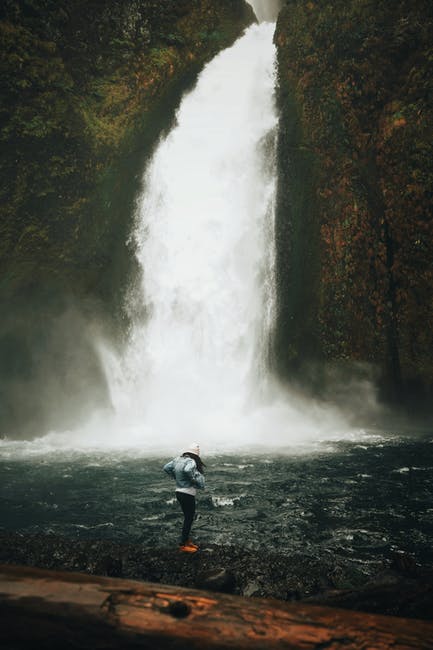 蓝色外套和黑色的裤子,站在瀑布附近的岩石上的人 · 免费素材图片