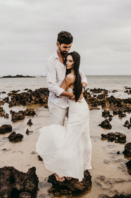 男人和女人站在岩石上拥抱 · 免费素材图片