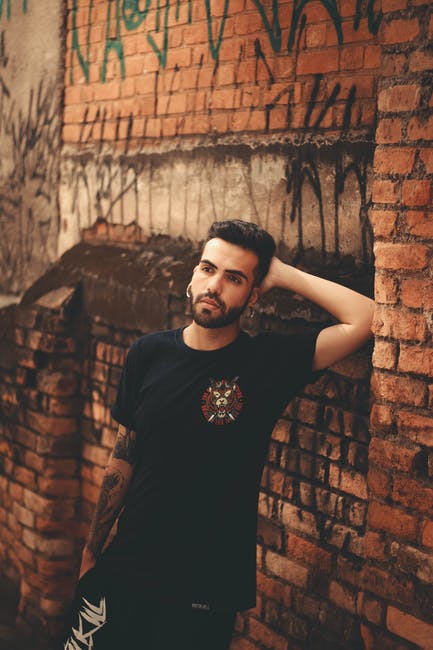 站在砖墙旁边的黑色圆领t恤的男人 · 免费素材图片