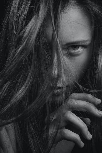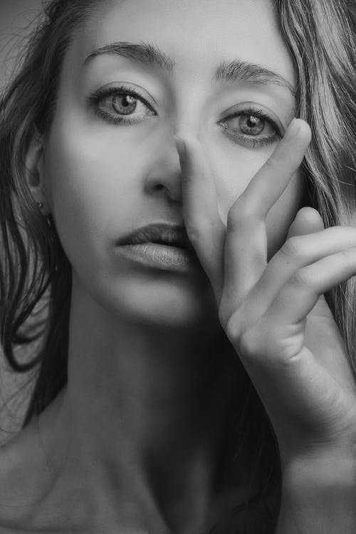 女人与她的头发遮住了脸的一部分合影的灰度特写照片 · 免费素材图片