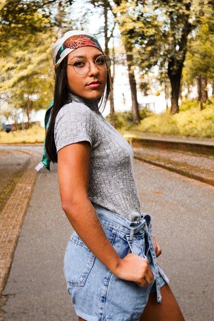 灰色的上衣和蓝色牛仔短裤,站在路上的女人 · 免费素材图片