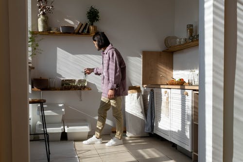 黑色的裤子,坐在棕色的木凳上的人 · 免费素材图片