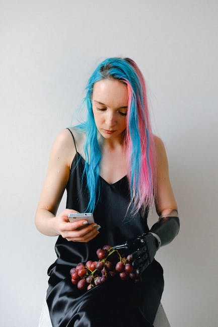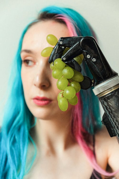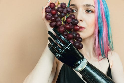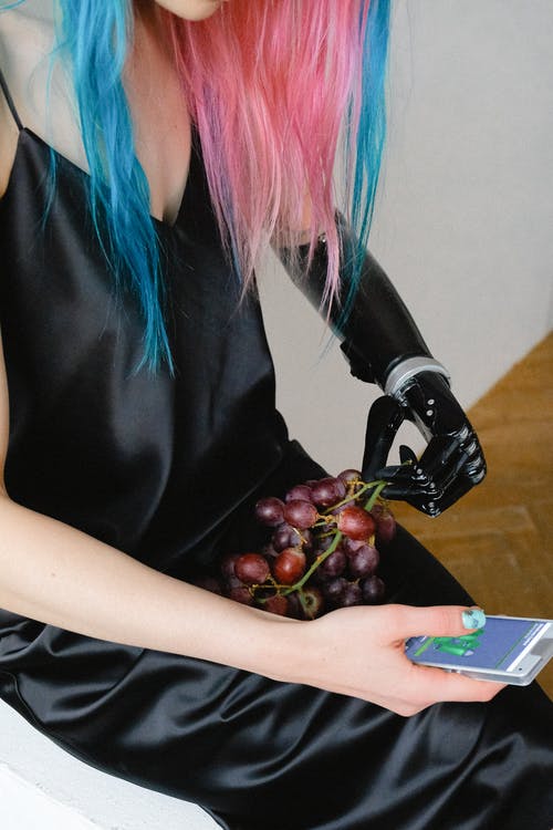 拿着一束葡萄和智能手机的黑色便裙的女人 · 免费素材图片