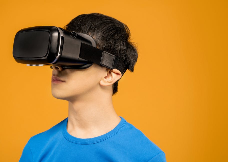 蓝色圆领衬衫的男人穿着黑色vr耳机 · 免费素材图片