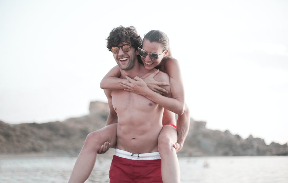 裸照的男人穿着红色短裤在海滩上背着女人的照片 · 免费素材图片