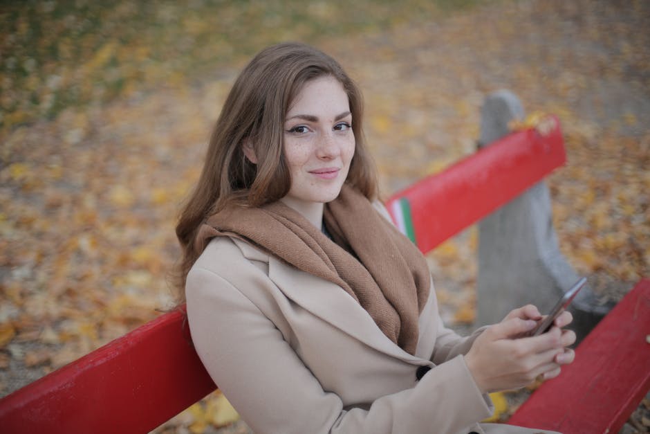 坐在红色长凳上的灰色外套的女人 · 免费素材图片