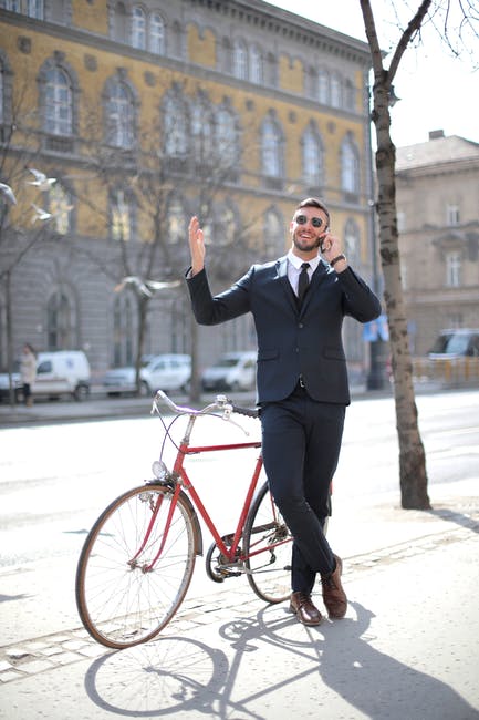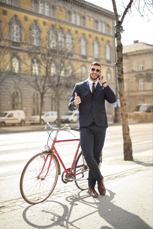 黑色西装外套和黑色的裤子,站在红色自行车旁边的人 · 免费素材图片