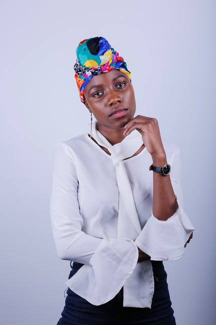 白色长袖衬衫,多彩多姿的头巾和黑色的裤子,摆在白色背景前的女人的照片 · 免费素材图片
