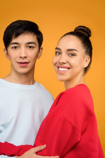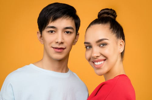 穿着白色乘员脖子t恤的男人站在红色乘员脖子t恤的女人旁边的肖像照片 · 免费素材图片