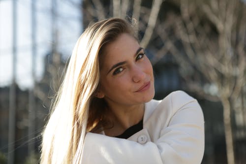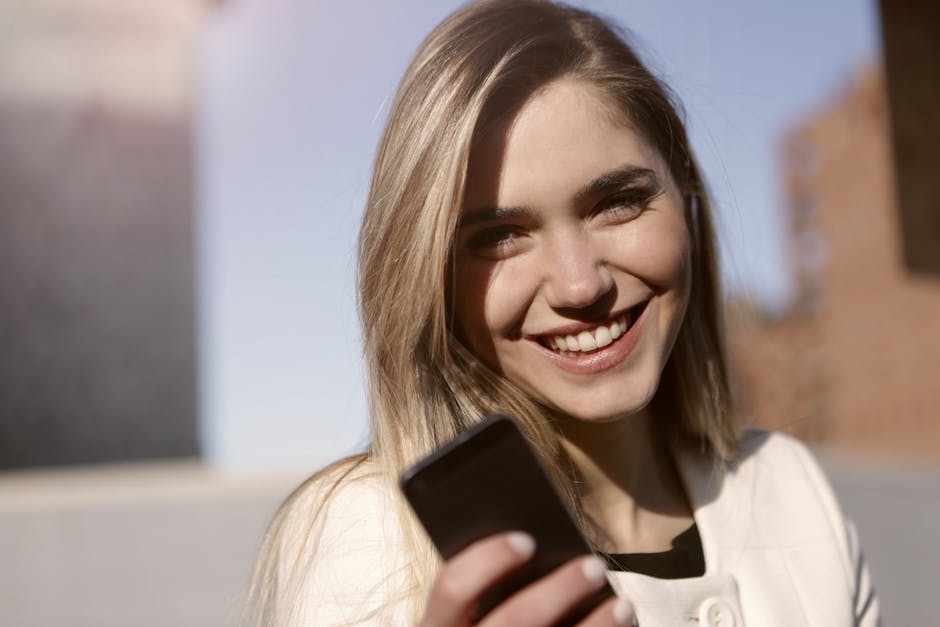 微笑的女士拿着黑色的智能手机 · 免费素材图片