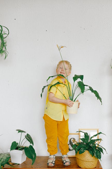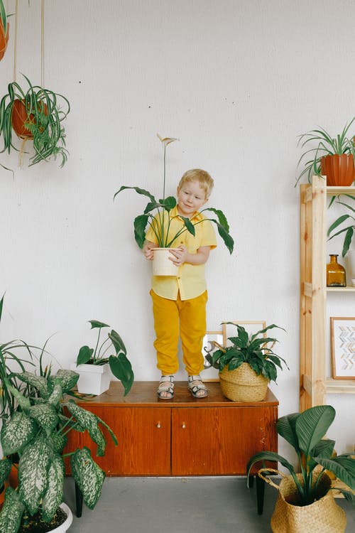 男孩抱着绿色的盆栽的植物 · 免费素材图片