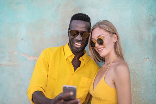 站在橙色背景前的红色运动衫的女人旁边的白色运动衫的男人的肖像照片 · 免费素材图片