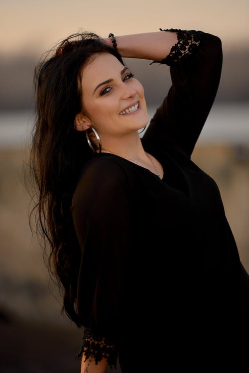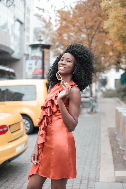 微笑的女人,穿着橙色无袖连衣裙站在人行道上,同时拿着眼镜的照片 · 免费素材图片