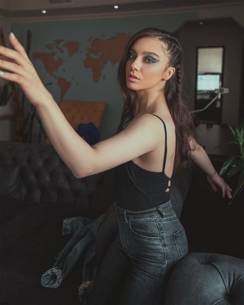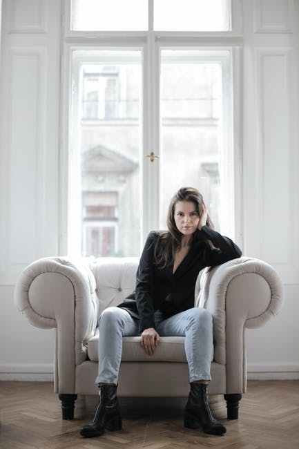 黑色外套和蓝色牛仔牛仔裤,坐在白色扶手椅上的女人的照片 · 免费素材图片