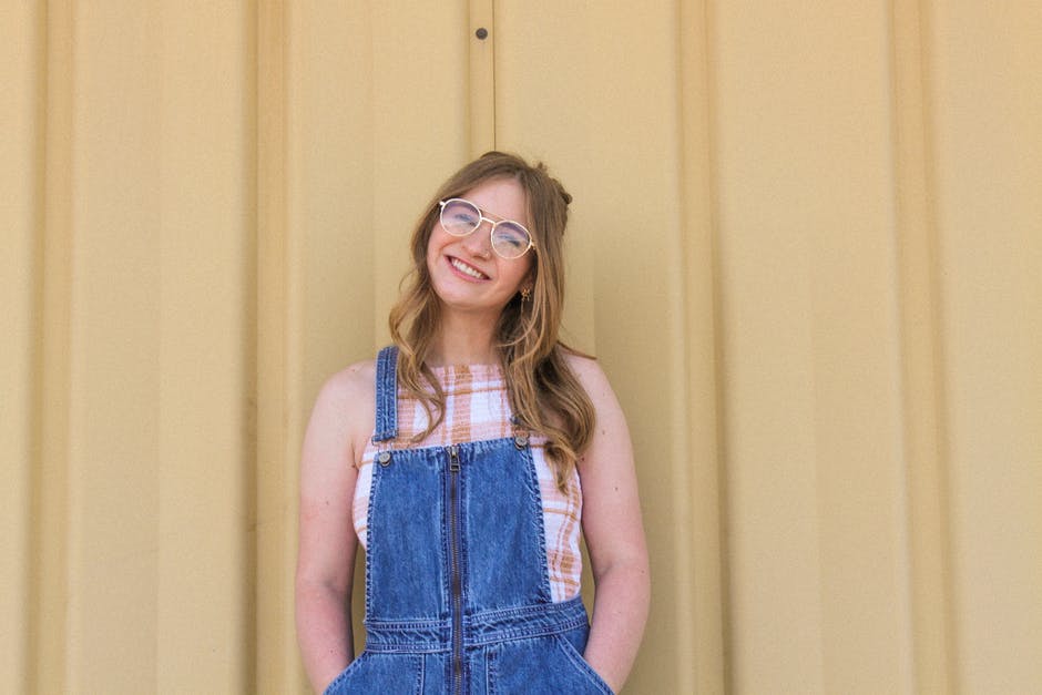 蓝色牛仔布粗斜纹棉布和棕色框架眼镜摆在微笑的女人的照片 · 免费素材图片