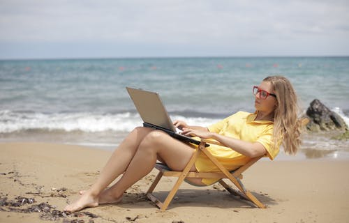 蓝色和棕色比基尼泳装的妇女坐在海滩的棕色木折叠椅 · 免费素材图片