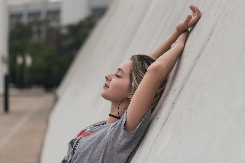倚在白墙上的灰色衬衫的女人 · 免费素材图片