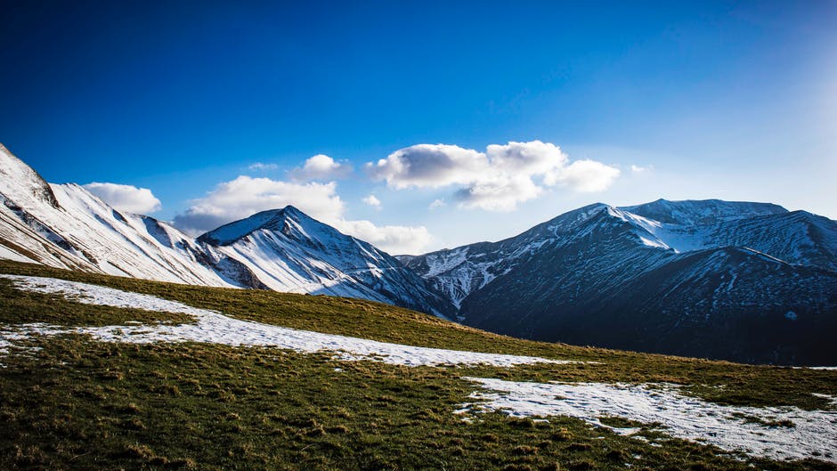 蓝色的晴空下的冰雪覆盖的山脉 · 免费素材图片