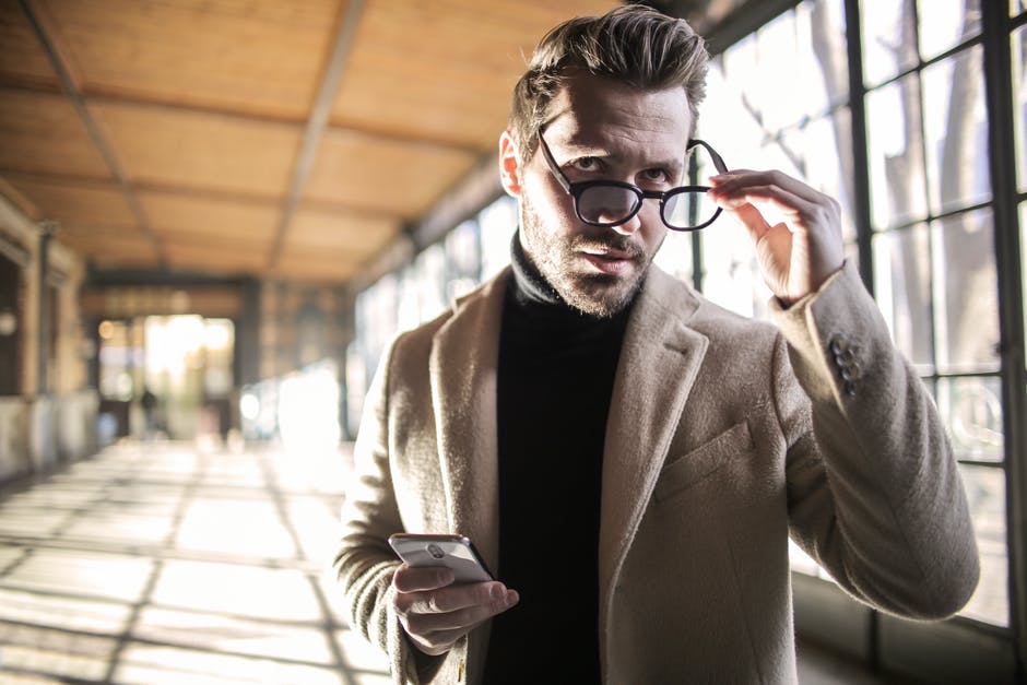 拿着他的黑框眼镜的棕色西装外套的男人 · 免费素材图片