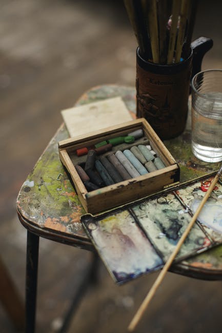 杯水旁边的木椅上的油漆刷 · 免费素材图片
