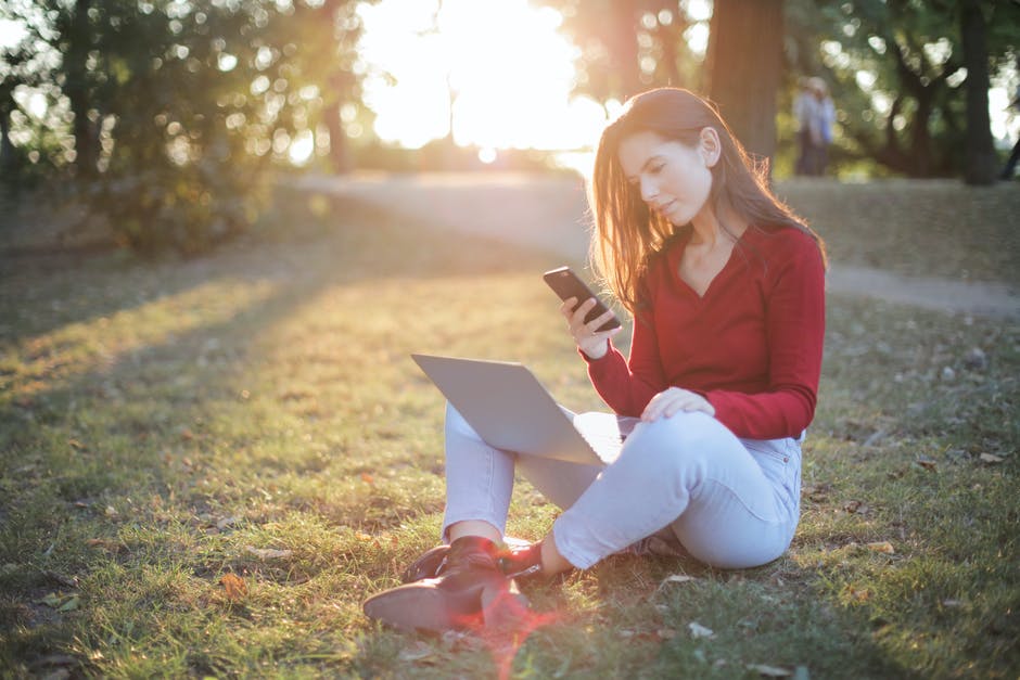 女人穿着一件红色的毛衣和蓝色的裤子,坐在绿草地上发短信,同时在她的膝盖上携带一台笔记本电脑的选择性焦点照片 · 免费素材图片