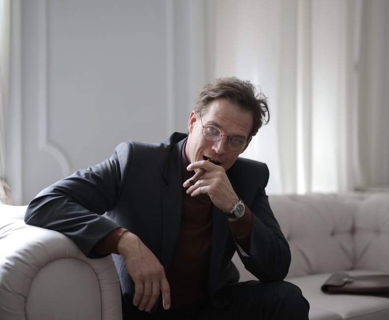 坐在黑色的西装,坐在白色的沙发上,抽着雪茄的男人的照片 · 免费素材图片